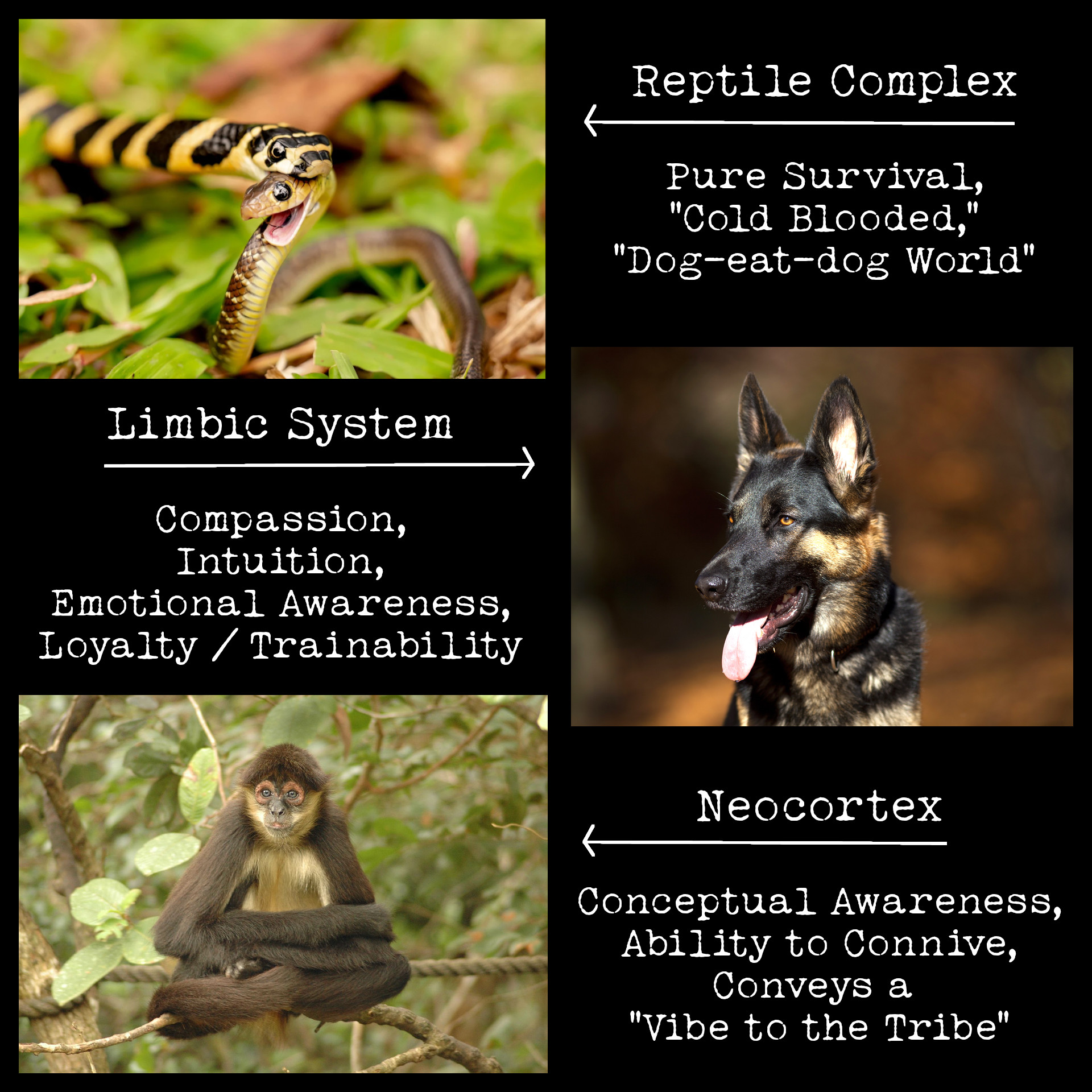The Triune Brain model was proposed by Dr. Paul Maclean. It is not the totality of neuroscience, but serves as an excellent basis for understanding. It also functions to show how our psyches have been hijacked as a form of ancient, weaponized psychology.